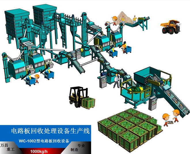 廢舊電路板是玻璃纖維強(qiáng)化樹脂和多種金屬的混合物,屬典型的電子廢棄物。線路板中的金屬品位相當(dāng)于普通礦物中金屬品位的幾十位至上百位,金屬的含量高達(dá)40%,最多的是銅,此外還有金、鋁、鎳、鉛、硅金屬等,其中不乏稀有金屬;而自然界中的富礦金屬含量也不過(guò)3%~5%。如果不妥善處理與處置,不但會(huì)造成有用資源的大量流失,而且其所含有鎘和溴化阻燃劑等大量致畸、致突變、致癌物質(zhì),會(huì)對(duì)環(huán)境和人類健康產(chǎn)生嚴(yán)重的危害。為此萬(wàn)昌特別生產(chǎn)制造了一種適合我國(guó)國(guó)情的高環(huán)保、高效率的全自動(dòng)化回收處理廢棄電路板生產(chǎn)線。