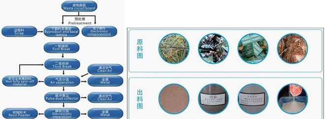 電路板處理回收生產(chǎn)線主要由拆解設(shè)備、輸送機(jī)、一級(jí)破碎機(jī)、二級(jí)破碎機(jī)、分選機(jī)、除塵、磁選機(jī)、粉碎機(jī)及其他輔助裝置等組成。(具體可參考工藝流程圖)廢棄電路板經(jīng)拆解后,將有害的電器組件如電池、變壓器等和可重新利用的零部件拆除后,剩余的部分經(jīng)刮板輸送機(jī)送至一級(jí)破碎機(jī),將物料破碎到20mm以下,再送到二級(jí)破碎機(jī)將物料破碎至5mm以下,經(jīng)分選機(jī)及磁選將含鐵物料分離出去,剩余的物料經(jīng)粉碎機(jī)碎至2mm左右的粉狀,才能將多層機(jī)板中銅分離開(kāi)來(lái),經(jīng)風(fēng)選將輕的粉塵先行分離,比重較大的物料送入靜電分選機(jī)將20%左右的有色金屬(銅等)分離回收。
