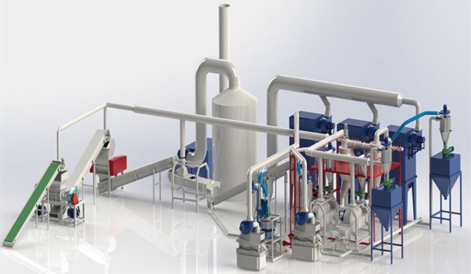 報廢鋰電池由輸送機送入一級撕碎機中進行撕碎,撕碎后的物料通過輸送機送入二級多刀破碎機中進行第二次破碎,二次破碎后的物料進入到輸送機中同時設(shè)置磁選設(shè)備,可以將物料中的鐵分選出來。分選后的物料經(jīng)輸送機送入氣流分選機,通過引風機和旋風下料器把正負極中的隔膜紙分離出來,把分選后的正負極片進入到三級粉碎機中進行細碎,將物料粉碎到20目左右。粉碎后的物料由負壓系統(tǒng)進入到旋風分離器中進行粉塵過濾,并通過兩次氣流分選,使不同密度的物質(zhì)進行分層,然后得到正負極材料與銅、鋁、鎳等材料,而所有的超細粉塵由負壓系統(tǒng)帶入脈沖除塵器中進行收集。而過濾得到的尾氣將繼續(xù)由負壓系統(tǒng)送入到尾氣處理設(shè)備中進行空氣凈化,使之達到國家排放標準后再進行高空排放。
