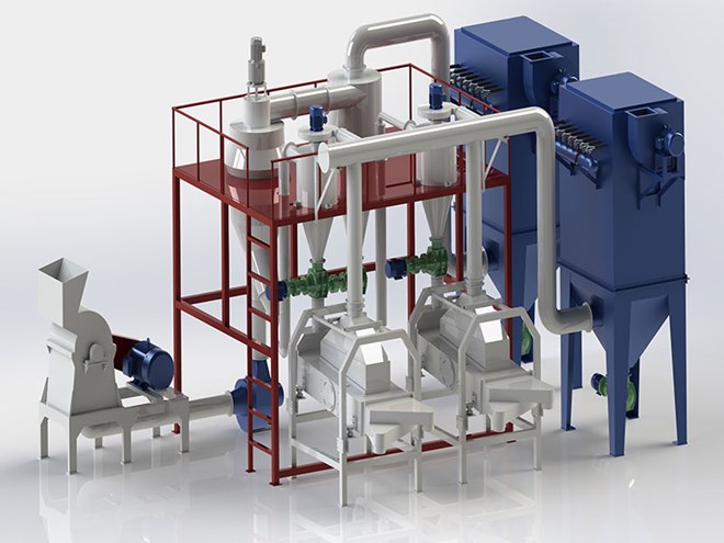 電池由輸送機(jī)送入一級(jí)撕碎機(jī)中進(jìn)行撕碎,撕碎后的物料通過(guò)輸送機(jī)送入二級(jí)多刀破碎機(jī)中進(jìn)行第二次破碎,二次破碎后的物料進(jìn)入到輸送機(jī)中同時(shí)設(shè)置磁選設(shè)備,可以將物料中的鐵分選出來(lái)。分選后的物料經(jīng)輸送機(jī)送入氣流分選機(jī),通過(guò)引風(fēng)機(jī)和旋風(fēng)下料器把正負(fù)極中的隔膜紙分離出來(lái),把分選后的正負(fù)極片進(jìn)入到三級(jí)粉碎機(jī)中進(jìn)行細(xì)碎,將物料粉碎到20目左右。粉碎后的物料由負(fù)壓系統(tǒng)進(jìn)入到旋風(fēng)分離器中進(jìn)行粉塵過(guò)濾,并通過(guò)兩次氣流分選,使不同密度的物質(zhì)進(jìn)行分層,然后得到正負(fù)極材料與銅、鋁、鎳等材料,而所有的超細(xì)粉塵由負(fù)壓系統(tǒng)帶入脈沖除塵器中進(jìn)行收集。而過(guò)濾得到的尾氣將繼續(xù)由負(fù)壓系統(tǒng)送入到尾氣處理設(shè)備中進(jìn)行空氣凈化,使之達(dá)到國(guó)家排放標(biāo)準(zhǔn)后再進(jìn)行高空排放。